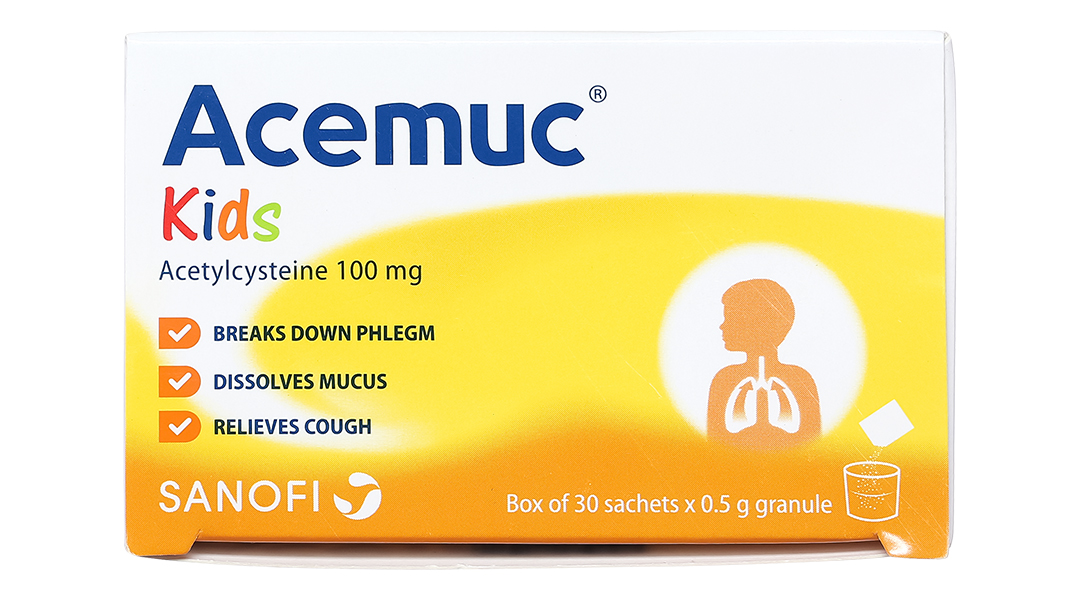Acemuc 100mg được bào chế dưới dạng thuốc cốm, thoảng mùi cam, vị ngọt, tan trong nước. Được đóng gói dưới dạng hộp 30 gói.
